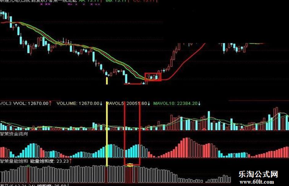 1、个股前期有较大幅度的下调“量能饱和度”从中选出红柱出现的个股,并跟踪观察;