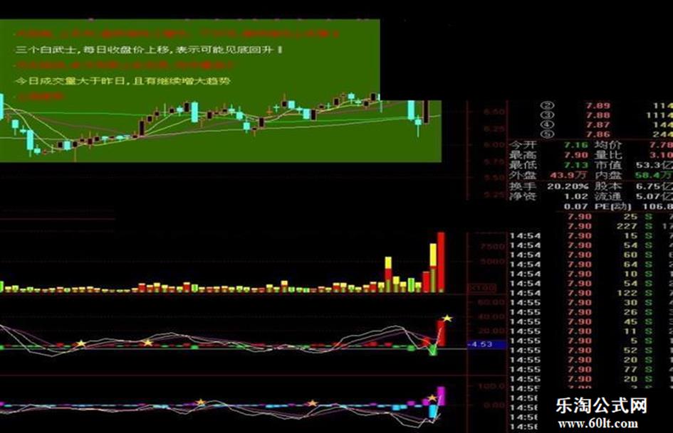 DRAWTEXT(T19=1 AND CURRBARSCOUNT=58,AAA-(AAA*TS19),'三个白武士,每日收盘价上移,表示可能见底回升‖'),COLORFFFFFF ;