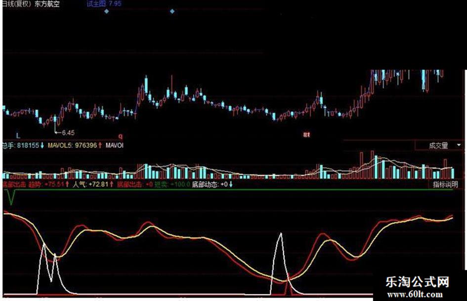 底部出击:IF(CROSS(趋势,人气) AND (趋势<30),20,0),COLOR0000FF,LINETHICK2;