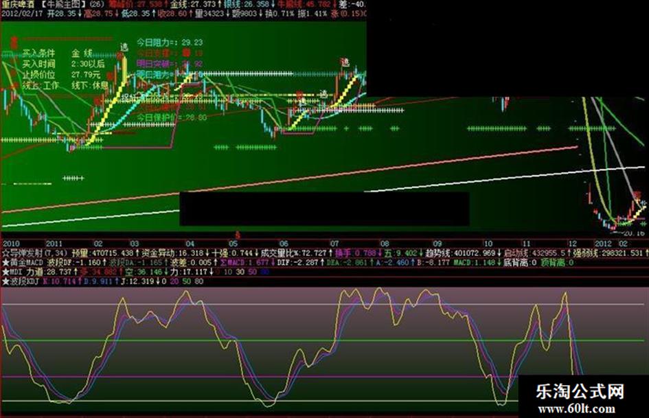 用法说明:重点关注J值配合主图用来逃顶抄底,当J值在五日内小于0后,主图中如果股价上穿底线同时J值拐头向上就是抄底时机;当J值下穿80,股价下穿金线就是逃顶时机,50为强弱分界线。