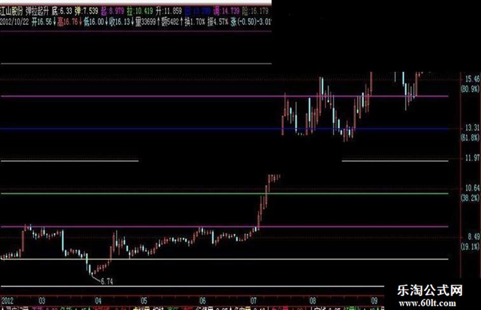 本指标采用黄金分割的19.1进行递进确定上升,各条线的名称很明确,就不再多说。使用时需要注意的是,必须待底部明确后,就是不再创新低的前提下。本人对照了各类个股包括熊股,感觉还可以,所以献出。