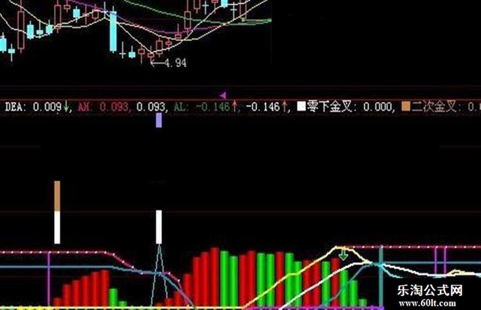 ■零下金叉:IF(CROSS(DIFF,DEA) AND DIFF<-0.001,0.3,0),COLORWHITE,POINTDOT;