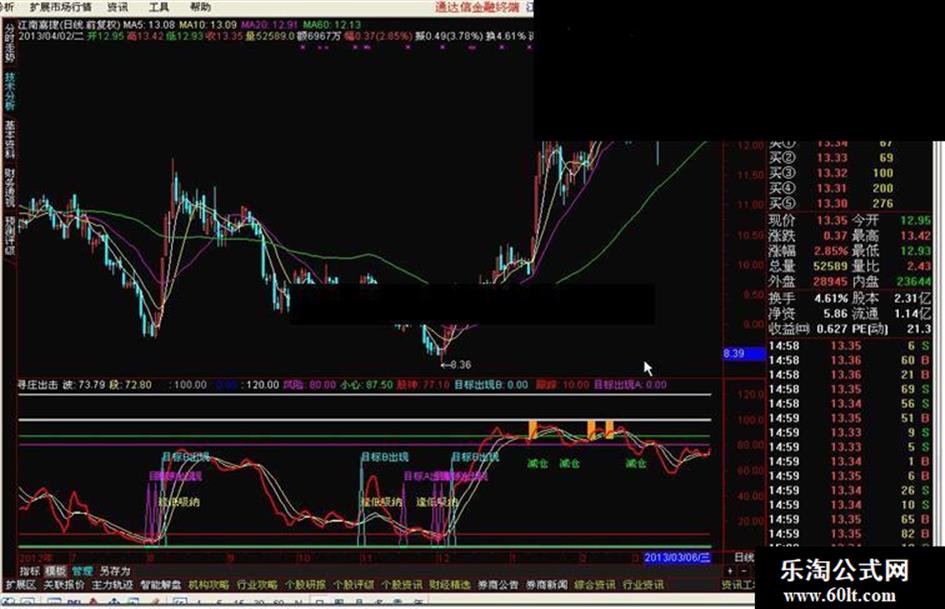 DRAWTEXT(CROSS(股海,90) AND (股神<40),75,'目标B出现'),COLORFFFF00;