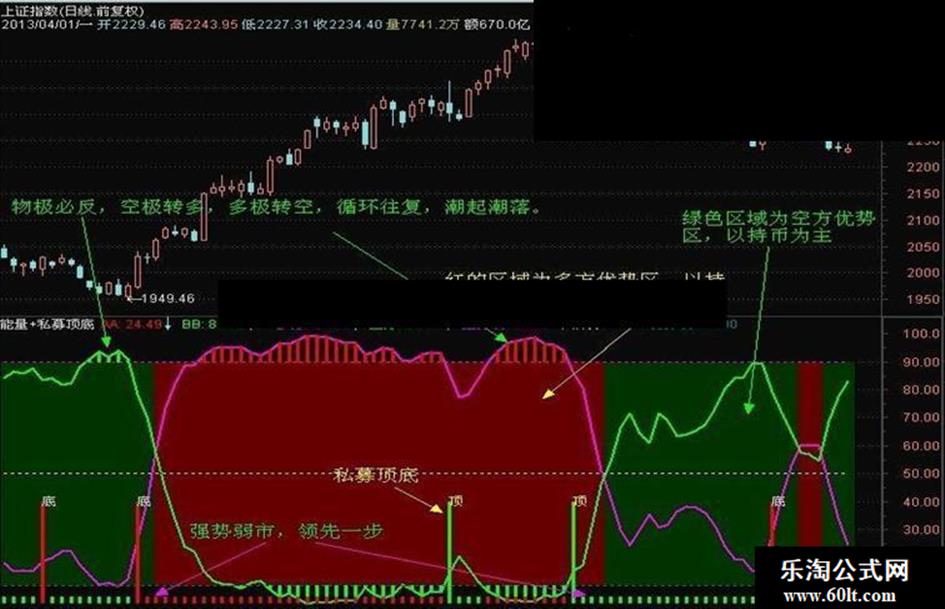 当多方线(洋红色线)突破强势线后需密切关注,在强势线上掉头向下可适当减仓,但在背景红色未变的情况下又掉头向上,可加仓跟进。当空方线(绿线)突破强势线后预示走势接近阶段底部区域,应密切关注进场时机,配合“底”部提示,成功率很高。