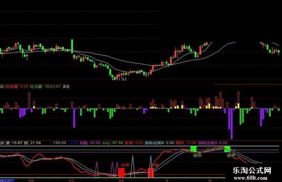 目标出现B:IF(CROSS(股海,90) AND (股神<40),70,0),COLORFFFF00;