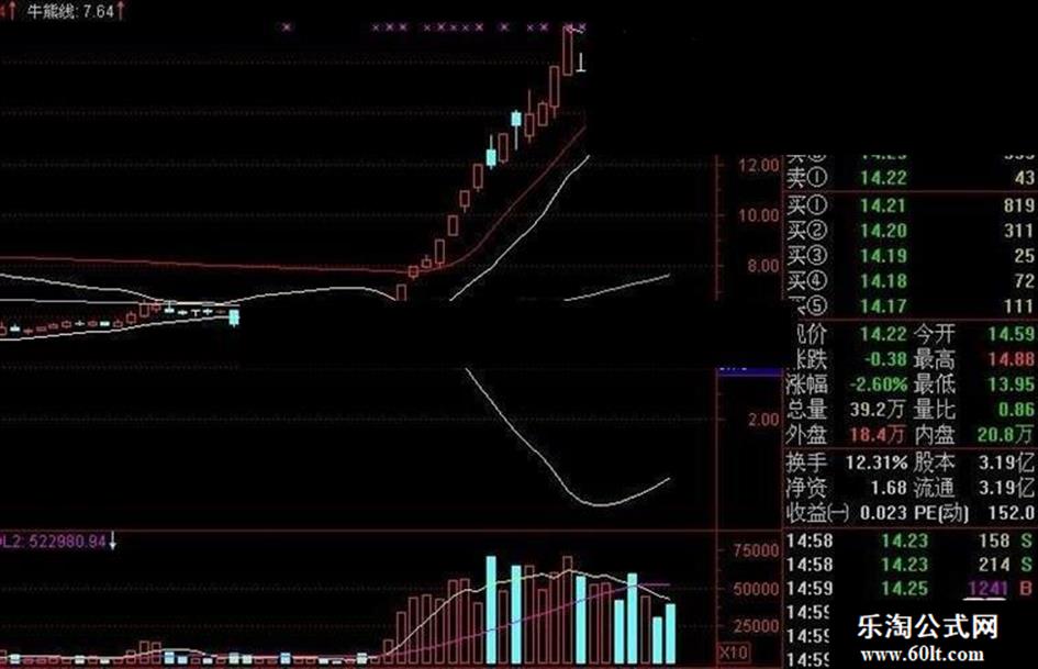 五,这点很重要,黄下穿白,红线的位置不能太高,那样的话,证明下面是小震荡或者回调,其实穿入也维持不了多久,所以抓大牛要参考红线,红线明显看出隔几天就会穿越K线就行,这个很容易看出