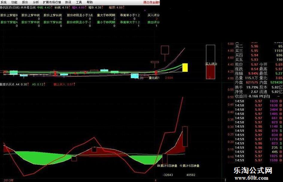 指标名称:《量提示买点》 本指标能显示今昨两天的五日累计净量,当增加时红线向上 当减少时红线向下,在低位上穿绿色带就是最好的买点; 【提示:本源码是用 .doc 文件提供源码,打开这个文件,需要密码,会破解密码的下载,否则别下载附件,对这类发布源码的朋友,本人只能说是无奈】