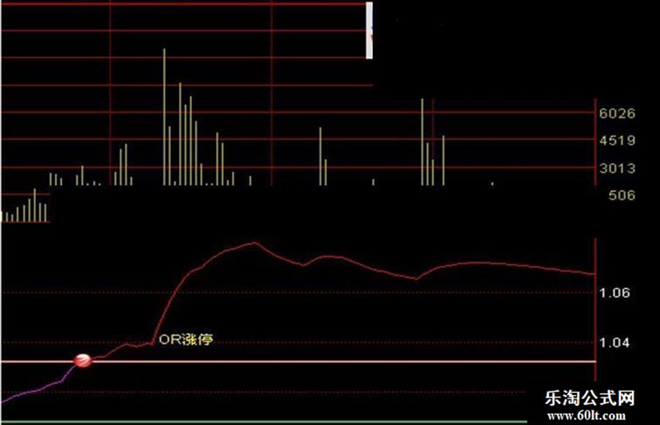 DRAWTEXT(CROSS(EXPMA((DCLOSE/TOU),20),1.04),1.04,'OR涨停'),COLORYELLOW;