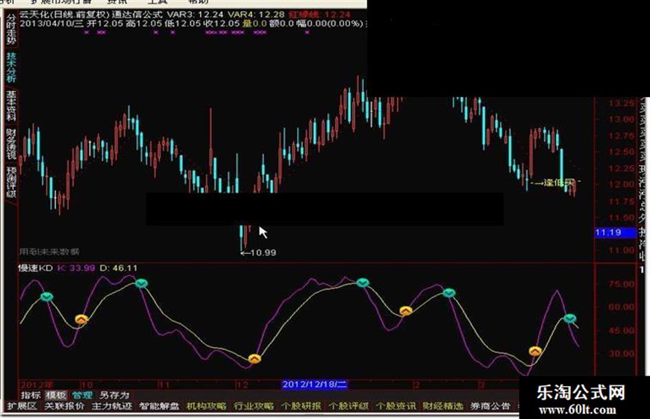 {慢速KD} N:=9;M:=3;MM:=5; RSV:=(CLOSE-LLV(LOW,N))/(HHV(HIGH,N)-LLV(LOW,N))*100; FASTK:=SMA(RSV,M,1); K:SMA(FASTK,M,1),LINETHICK1,COLORMAGENTA; D:SMA(K,MM,1),LINETHICK1,COLORYELLOW; DRAWICON(CROSS(K,D),K,34); DRAWICON(CROSS(D,K),D,35);