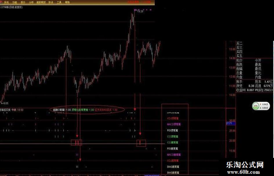 再后来就是:背离之后还有背离。。。一般来说。顶背离比底背离来的可靠下。。那么怎么判断有没背离呢?我自己弄了一个指标。。里面包括kdj, cci, bias,macd等等几个常用指标的背离。