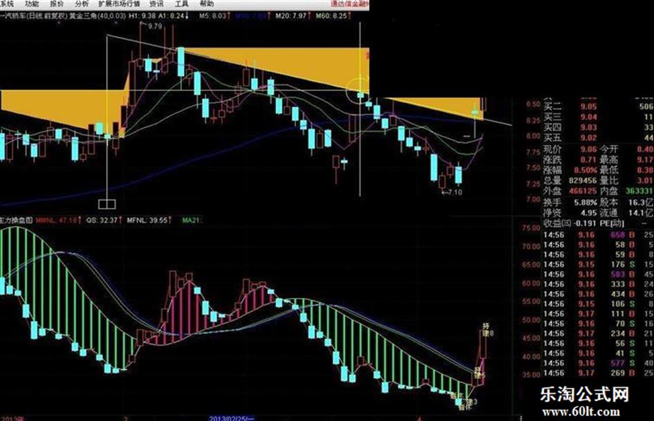 在指数长期下跌后,我们可以通过寻找那些领先于指数底部抬高的个股,这些个股往往是主力资金提前布局的股票,找到这样的股票以后,我们就找到它底部打桩区间的一个高点做为原点,通过这个原点与一个近期的历史高点做线,得到一根杠杆,另外一根杠杆就是这个原点底部区间的高点连线或者就是通过它做的水平线。股价要上涨,必须突破这两根杠杆,只要股价放量突破这两根杠杆,那么这两根杠杆就能够撬动股价向上喷发,在突破之后可能会出现缩量反压杠杆的情况,这是逢低吸纳的良机!