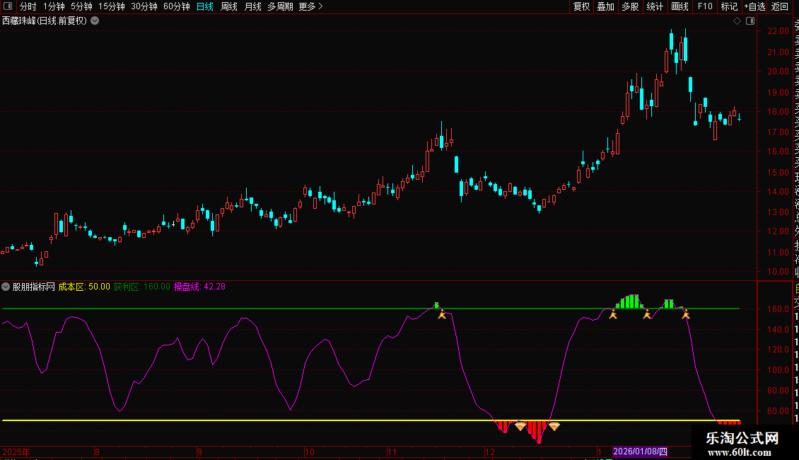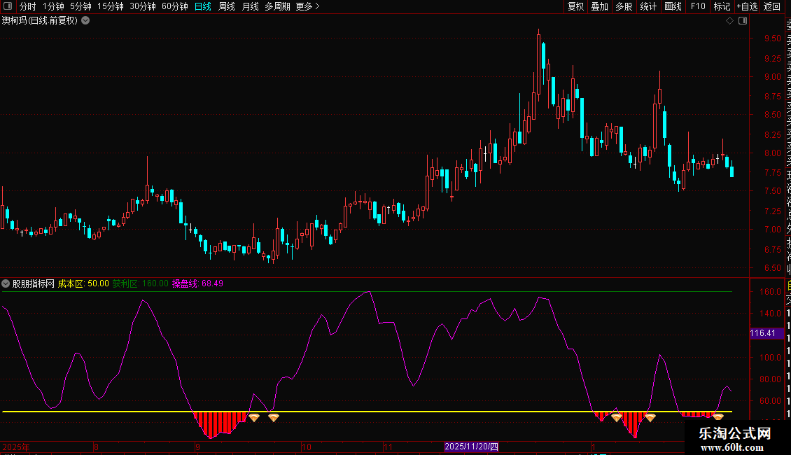 1. 主图信号系统:基于改良的随机指标(KDJ)计算出一条“操盘线”(N值)。它在K线图下方通过彩色柱状带和水平线,清晰划分出“关注区”(N<50)、“成本区”(N=50)和“风险/获利区”(N>160),并配有上穿50的买入图标与下穿160的卖出图标。
