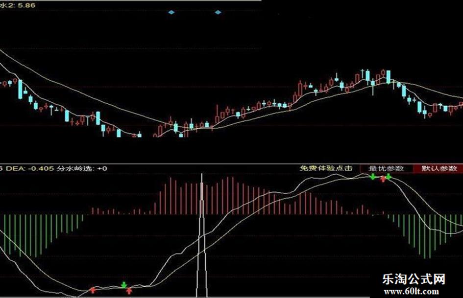 选股 分水1:=(EMA(CLOSE,5)*7+EMA(CLOSE,10)*3)/10; 分水2:=DMA(EMA(CLOSE,12),SUM(VOL/CAPITAL,5)/3); 分水岭选:CROSS(分水1,分水2);