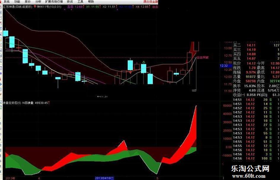 用法:结合净量走势图,股价上穿一条支撑线建仓三成,突破压力线加仓,突破出击线持股