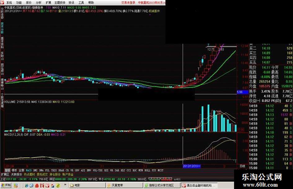 用法:当均线趋向多头排列,红方块逐渐变大时,若量能温和放大,且MACD即将上穿零轴或已经上穿零轴,即可买入;只要红方块没变蓝,就可继续持有,这样可以避免K线等其他指标的干 扰,骑的稳,拿得住。 当变为蓝方块,可考虑波段操作,卖出部分或全部筹码,若此时大盘向好,而个股均线系统还呈多头排列,也可继续持股,进行中长线操作,会有较大收益。 结合2012年12月大盘向好,我抓住了维科精华一波走势,目前我感觉第二波又来了,你说呢?