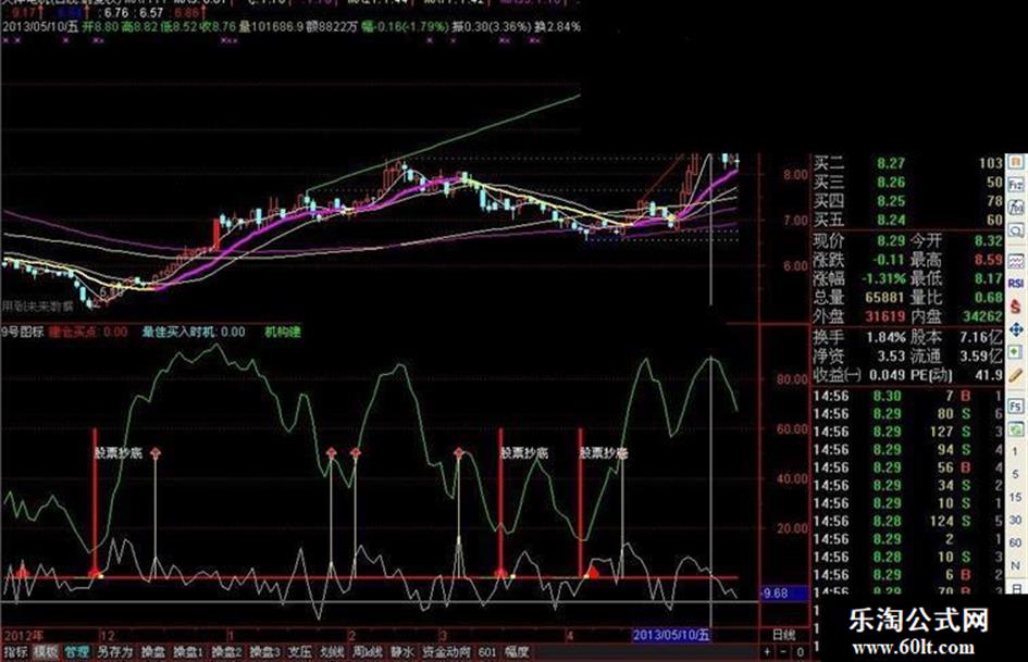 建仓买点:IF(CROSS(VAR2,VAR3) AND (VAR2<40),5,0* 10000),COLOR0000FF,LINETHICK2;