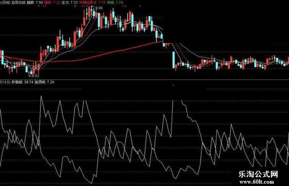 取自于系统的一个常规指标,在使用中感觉线束太多而影响视线,尝试化繁为简后留下最为适用的两条线.白线为抄底线,黄线为逃顶线. 参数设置: 1为N 最小为2.00 最大为90.00 缺省为14.00 2为MM 最小为2.00 最大为60.00 缺省为6.00 使用方法: 当白线在下和黄线形成对角尖角时为抄底时机; 当黄线在下和白线形成对角尖角时为逃顶时机; 对角时对得越直准确度越高,需自己慢慢体会,如在结合其老师的趋势指标则更为准确.仅在此大家切磋.