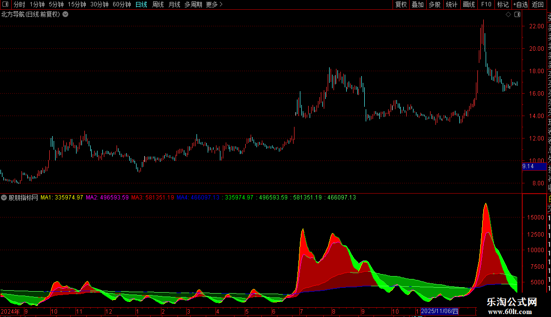 3. 均线上升时显示彩色线条,下降时显示绿色线条。