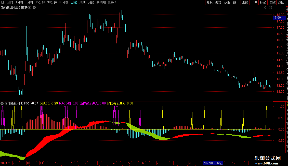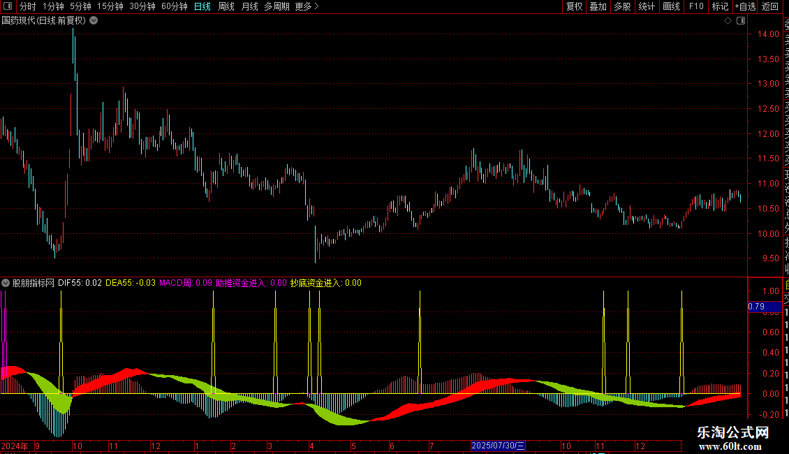 指标会在副图绘制MACD风格的曲线和柱状图,直观显示资金趋势。