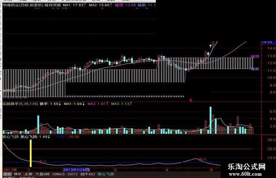箱顶:=PEAK(CLOSE,13,1)*0.98 ; 箱底:=TROUGH(CLOSE,8,1)*1.02; AA:=CROSS(REF(C,1),箱顶); BB:=CROSS(OPEN,箱顶); DD:=C>O; 突破:AA AND BB AND DD;