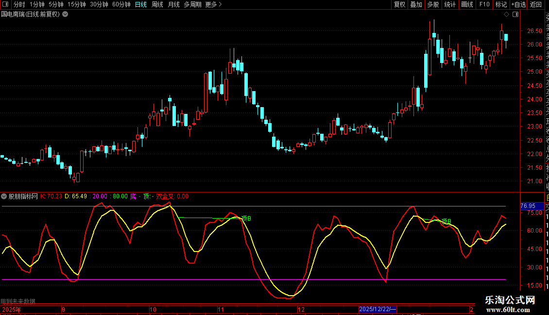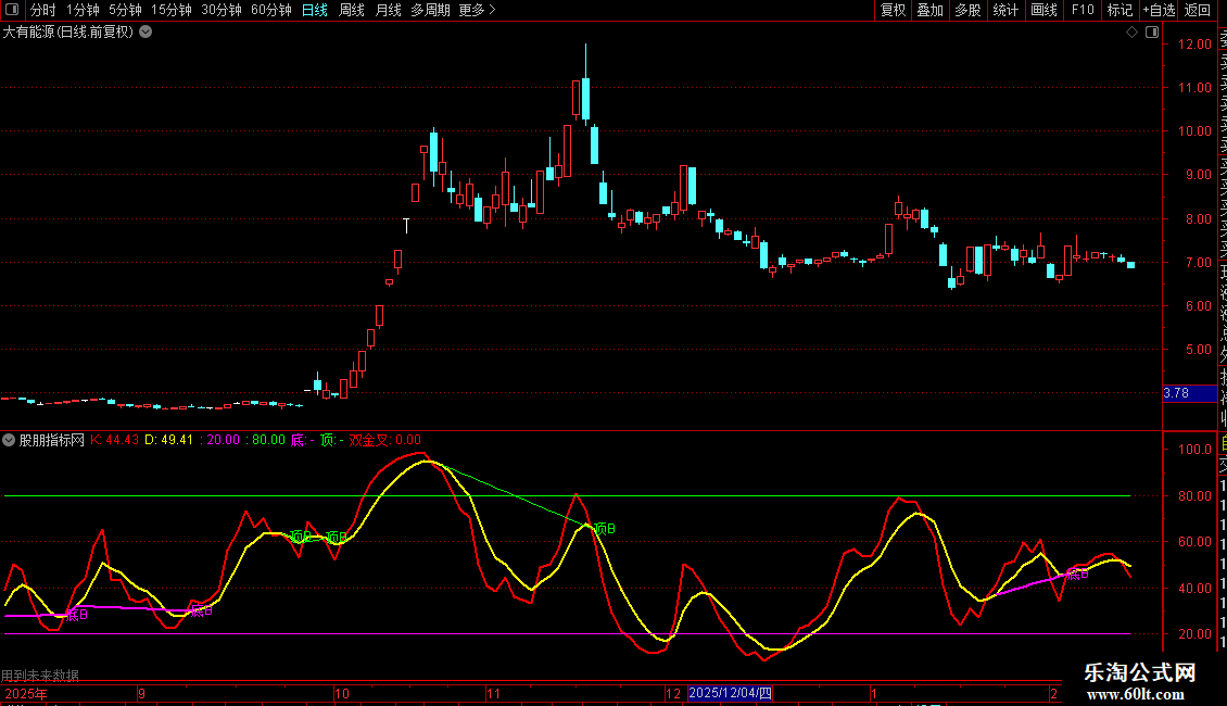 2. 在K、D金叉且股价创新低时标记“底B”,提示底背离;在死叉且股价创新高时标记“顶B”,提示顶背离。
