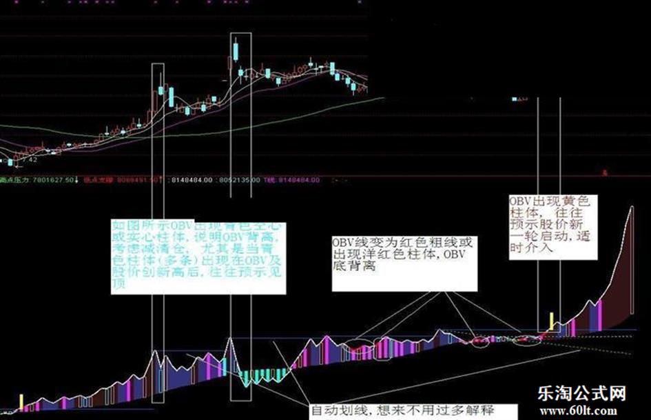 IF(OBV>=REF(OBV,1) AND L<REF(L,1),OBV,DRAWNULL),COLORLIRED,LINETHICK4;