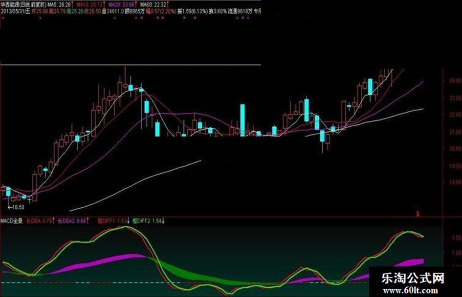 指标可取名为MACD全景,图中的色块部分即长线部分,二条线即短线部分,在长线色块为红色时,如短线二线金叉或刚金叉不久则可大胆做多,这时胜算会较大.