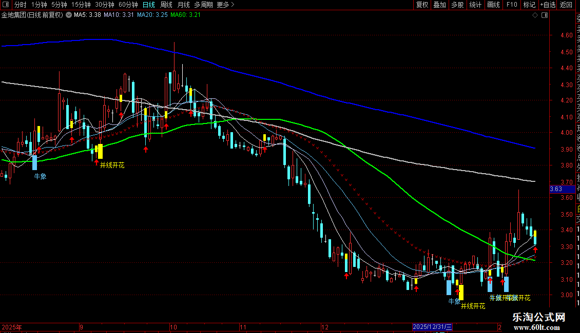 DRAWTEXT(MA3>=REF(MA3,1) AND MA1>=REF(MA1,1) AND CROSS(C,MA3),L-0.13,'牛象'),COLORFFCC66;