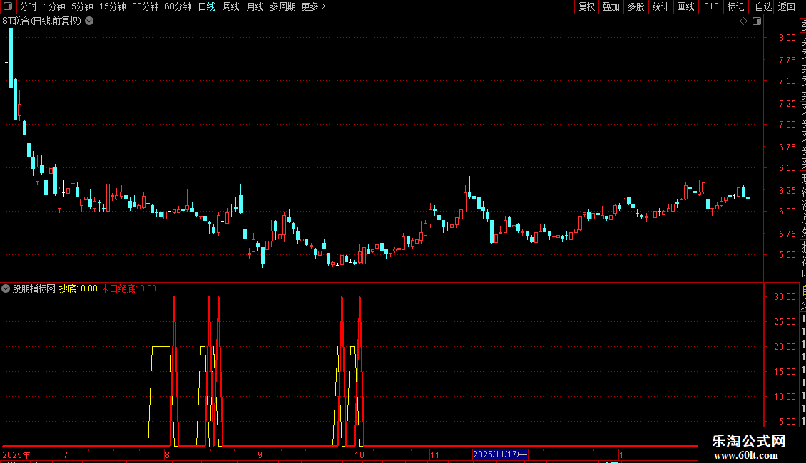 末日绝底信号: 当指标显示为30的红色粗柱状线时,表示“抄底”信号刚刚消失,可能意味着一个更强烈的底部确认点或“绝地反弹”机会。