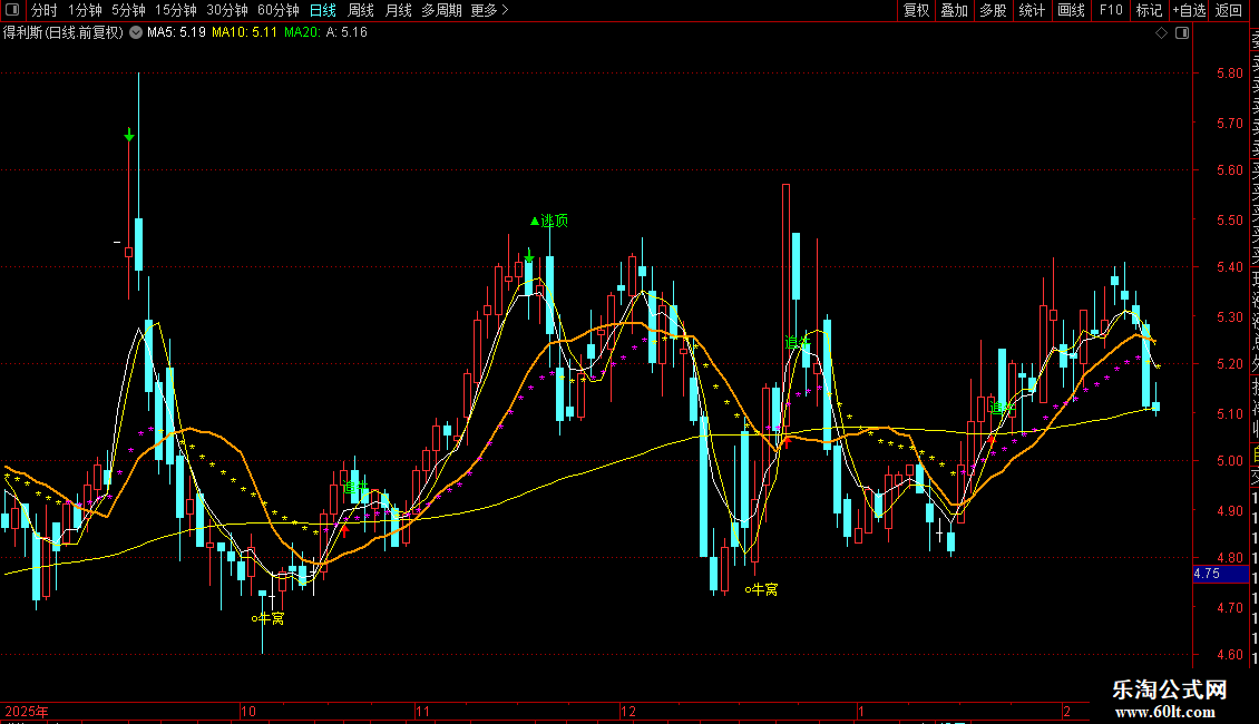 彩色均线(黄、粉、青)用于观察短期趋势与支撑压力。