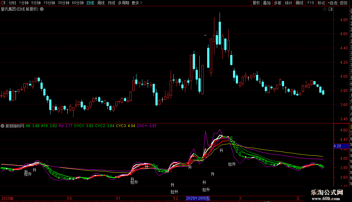 副图:用于观察股价与各条均线、成本均线的相对位置关系,以及“升”/“拉升”信号的出现,辅助判断趋势和入场时机。