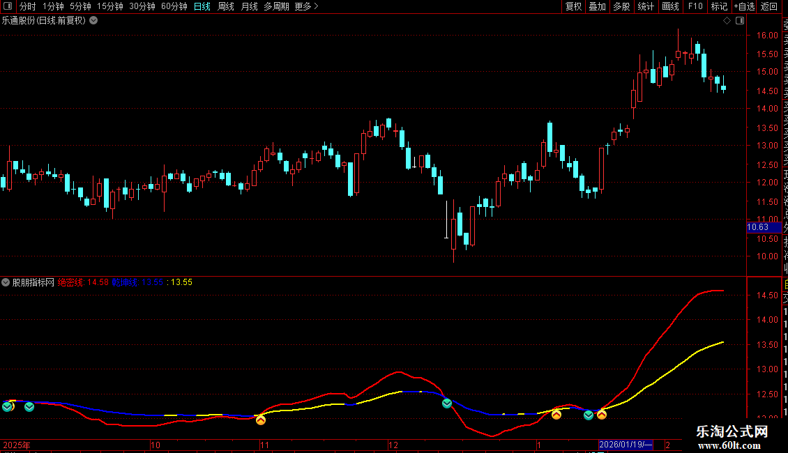 指标包含两条均线(绝密线和乾坤线)及买卖信号。