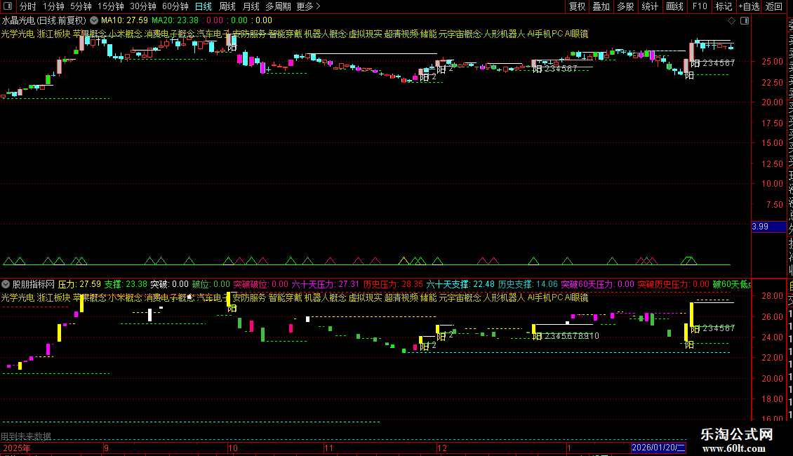 高低点标识:用特殊颜色的K线或半色K线标记创60日或历史新高/低的K线。