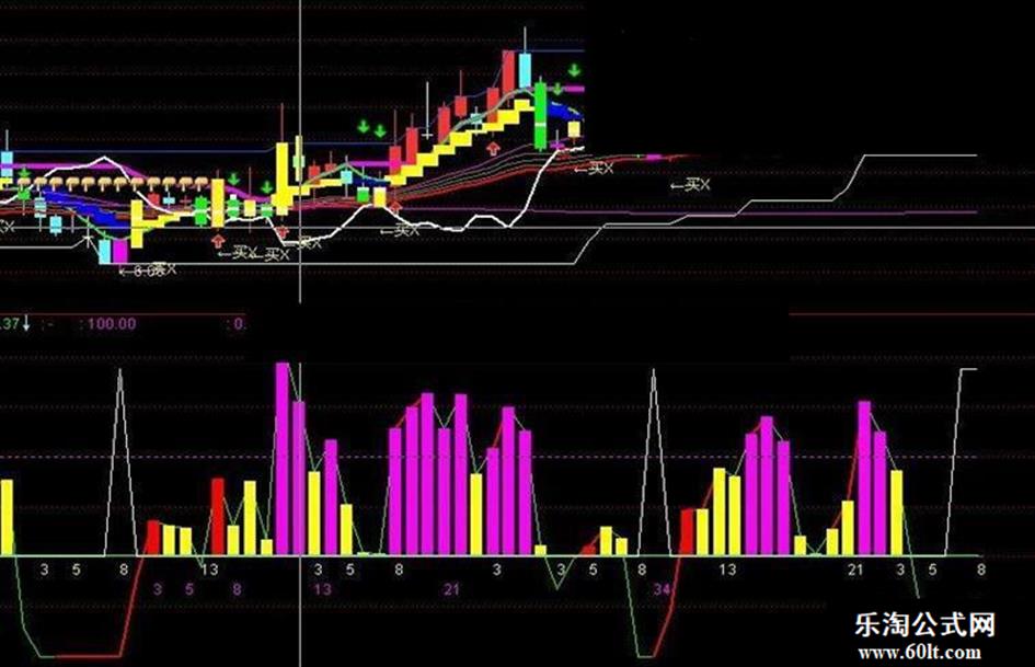 买点:=IF(CROSS(J18,J2),5,10*1000),COLORFF00FF,LINETHICK2;