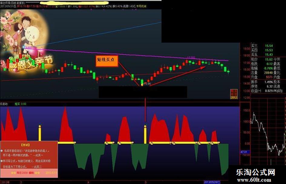 【特别提示】这里要提醒各位注意:任何公式反映的都只是编写人的一个思路,想要用一个简单的公式就涵盖整个股票市场的风云变化,从而一劳永逸,那只能是你的一厢情愿!迄今为止,世界上找不到一个放之四海而皆准的公式!因此,切忌照搬照抄。怎样因人、因时、因势从而巧妙、有效的运用公式就要看你的操作水平及操盘技巧了。