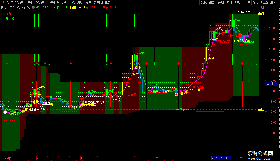 5. 箱体与支撑阻力:绘制“箱顶”、“箱腰”、“箱低”三条水平线,构成动态箱体,标识近期关键的压力与支撑区域。同时计算“突破”、“再突破”、“回踩”等关键价位线。
