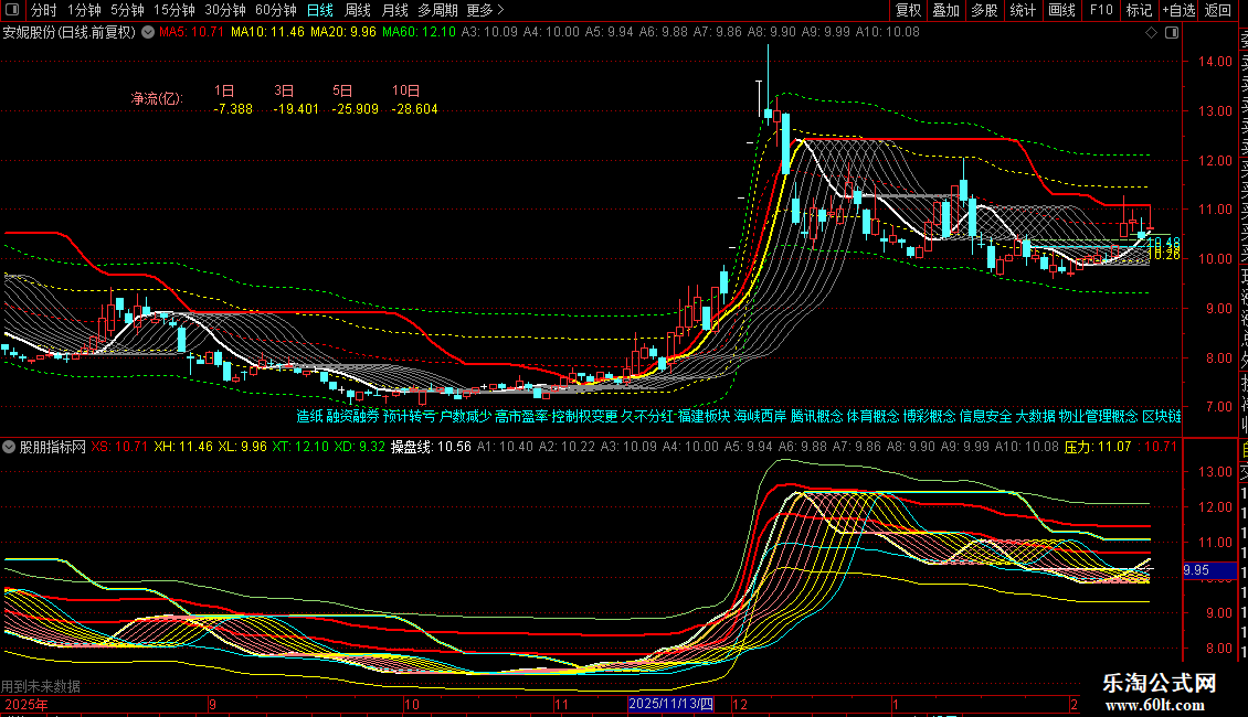 5. 资金流分析:在副图或K线图角落固定显示1日、3日、5日、10日的净资金流入(亿元)数据。