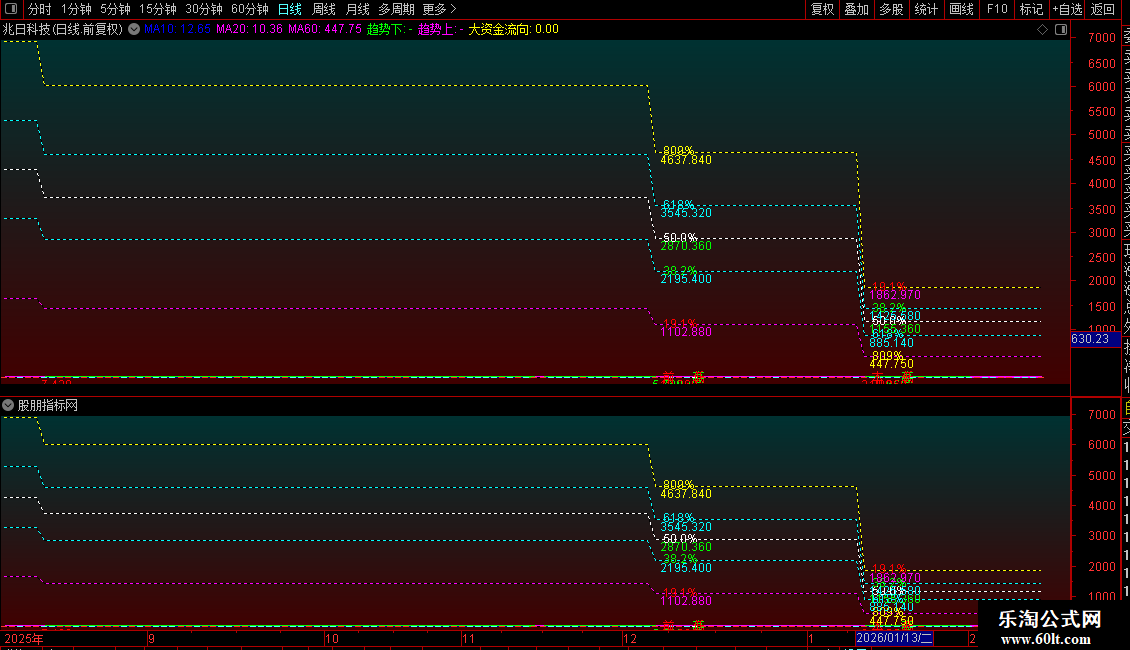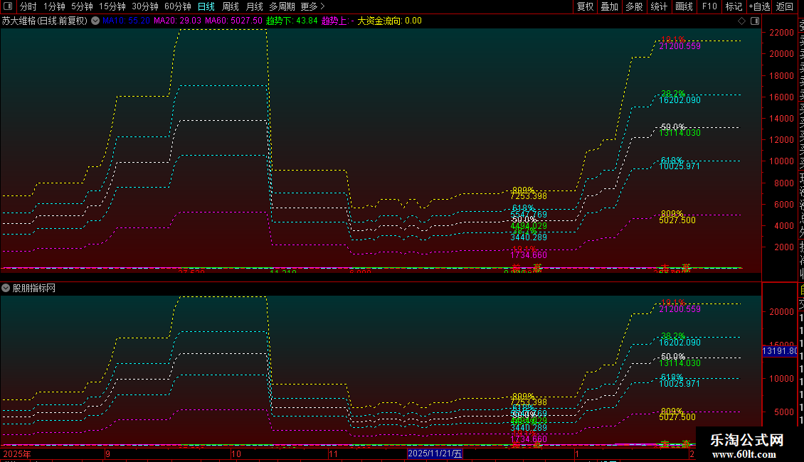 3. 黄金分割线:基于动态高低点,绘制一组黄金分割位(如0.191, 0.382, 0.5, 0.618, 0.809),作为潜在的支撑阻力区。