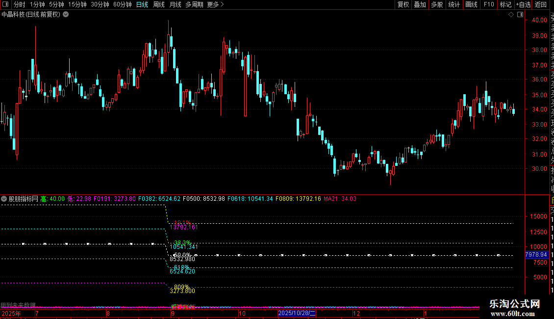 2. 黄金分割线:以识别出的波段高、低点为基准,绘制出19.1%、38.2%、50%、61.8%、80.9%等多条黄金分割位水平线,用于判断潜在的支撑与阻力。