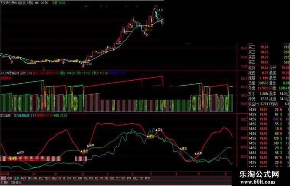 买入:DRAWTEXT(CROSS(趋势线,判断),趋势线+10,'▲买牛'),LINETHICK2,COLORWHITE;