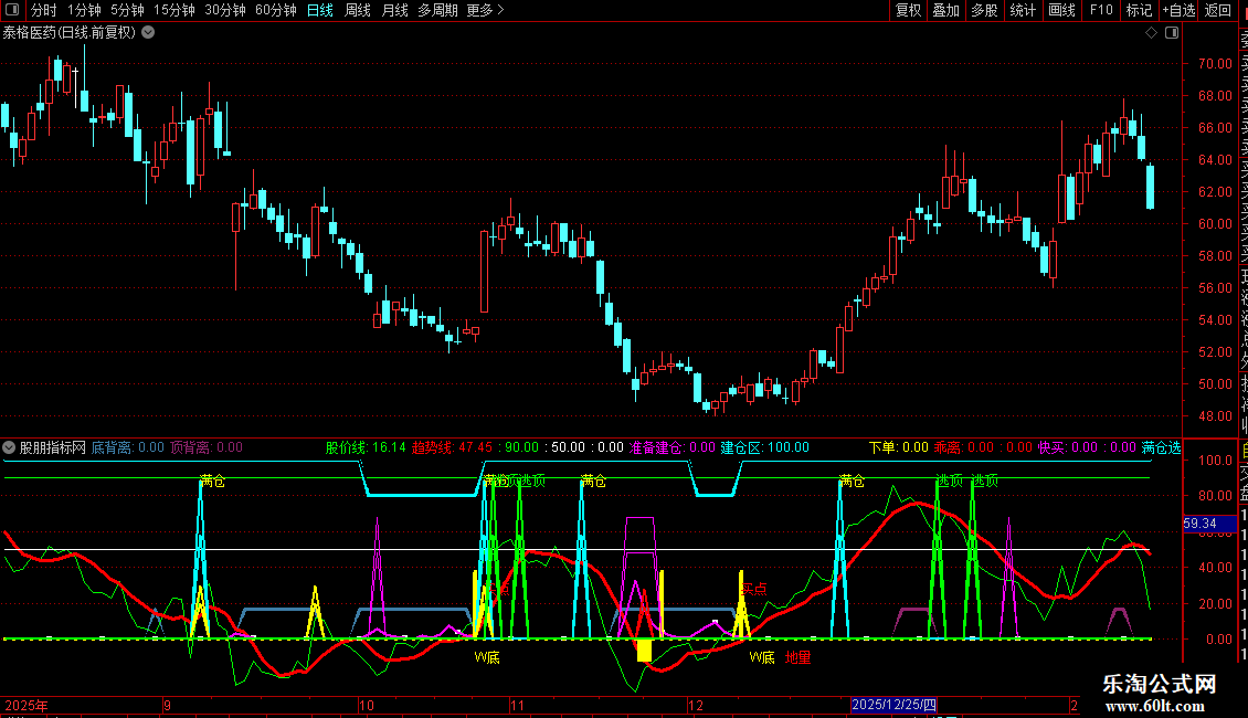 指标在副图区域显示为多条曲线、带状区域和文字信号点。