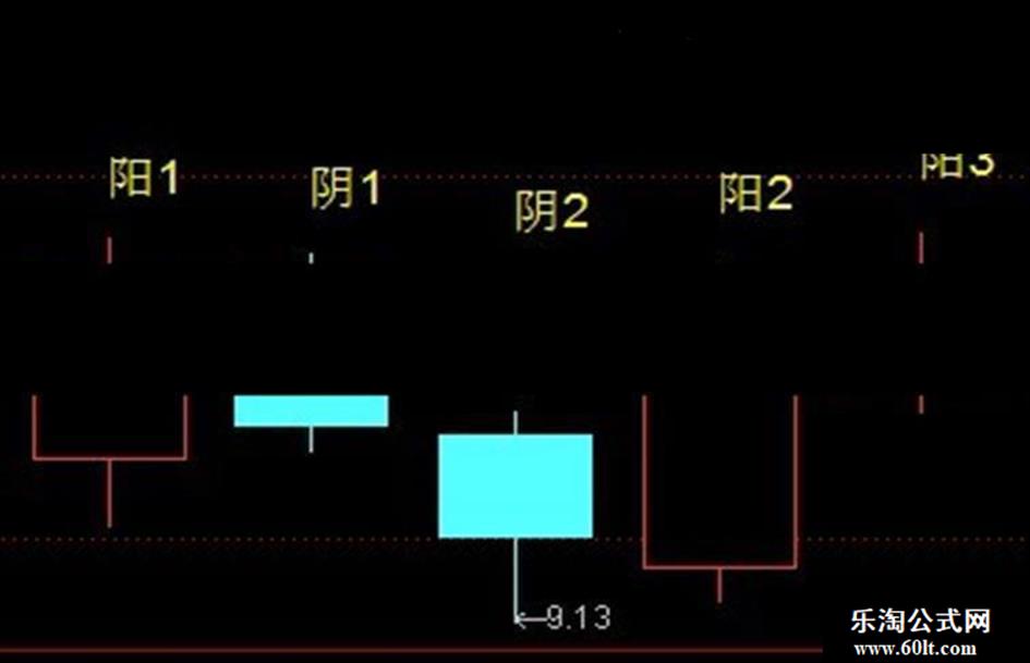 条件:阳1后可以有若干根阴线,当阴2出现后才满足条件(收盘在K1实体之下)