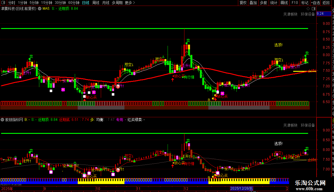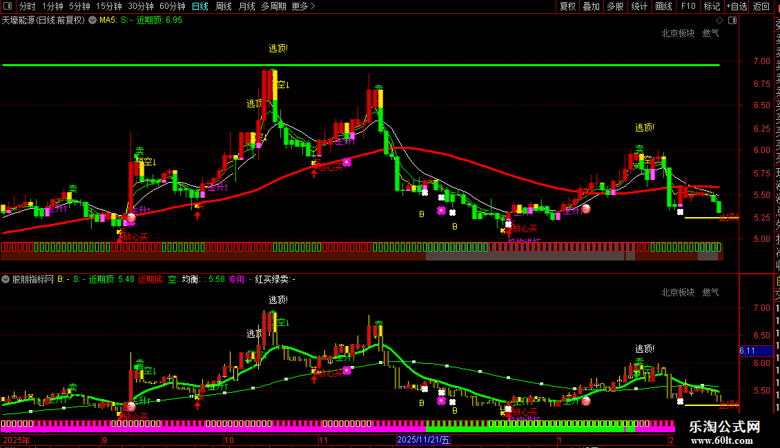 指标中大量使用了未来函数`ZIG`,会导致信号在历史K线上看起来非常准确,但在实时行情中可能发生变化或消失,请务必注意其滞后性和可能的重绘问题,不建议作为独立的交易依据。