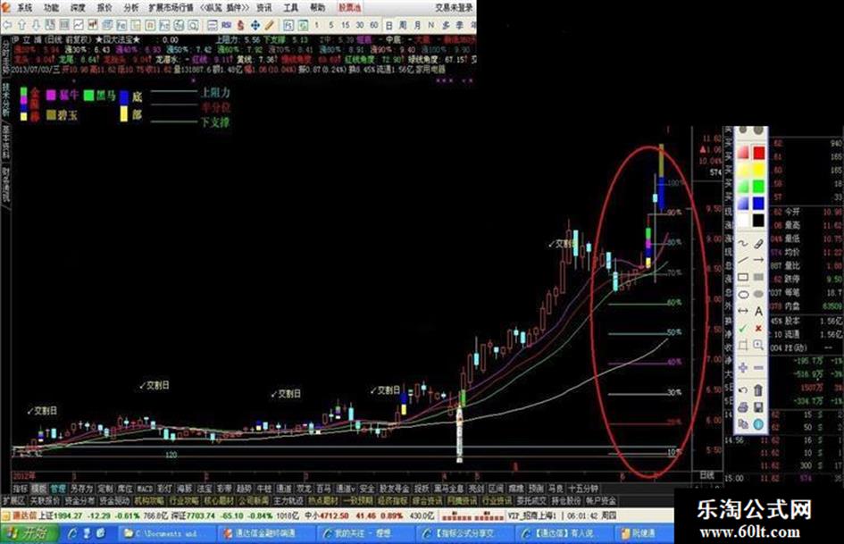涨60﹪:IF(CURRBARSCOUNT<=10 AND H>REF(C,DAYS)*1.6 ,REF(C,DAYS)*1.6,DRAWNULL),COLORGREEN;