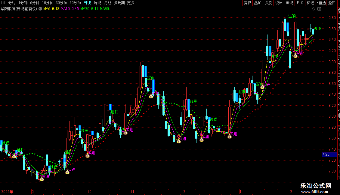 2. 20日均线参考与标记:计算20日简单移动平均线(MMM)。当收盘价高于此均线时,在均线位置用蓝色“”标记;低于时用绿色“”标记,直观显示价格相对于中期均线的位置。
