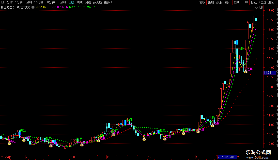 “逃顶”信号:通过另一组条件组合(VARD至VAR1A),识别出潜在的顶部反转或下跌启动形态。当条件满足时,在K线高点附近显示“逃顶”文字。