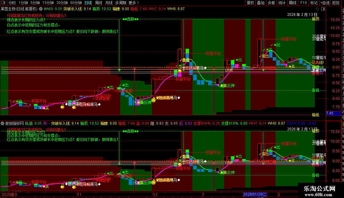 2. 多空背景:根据快慢线关系,用不同颜色填充60周期的高低区间,直观显示多空状态。
