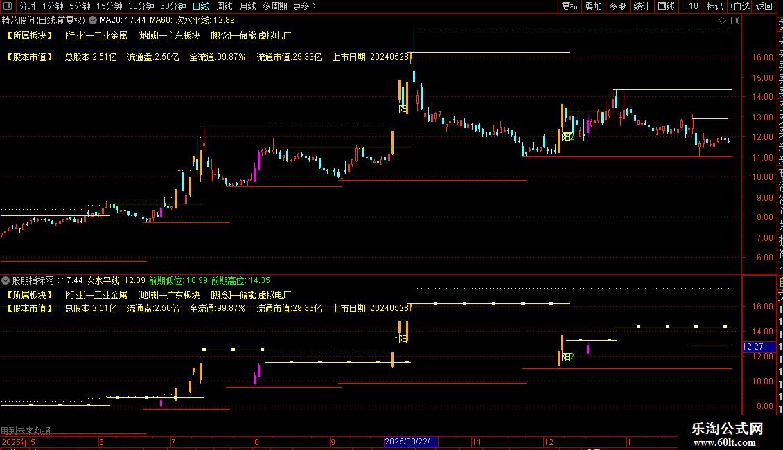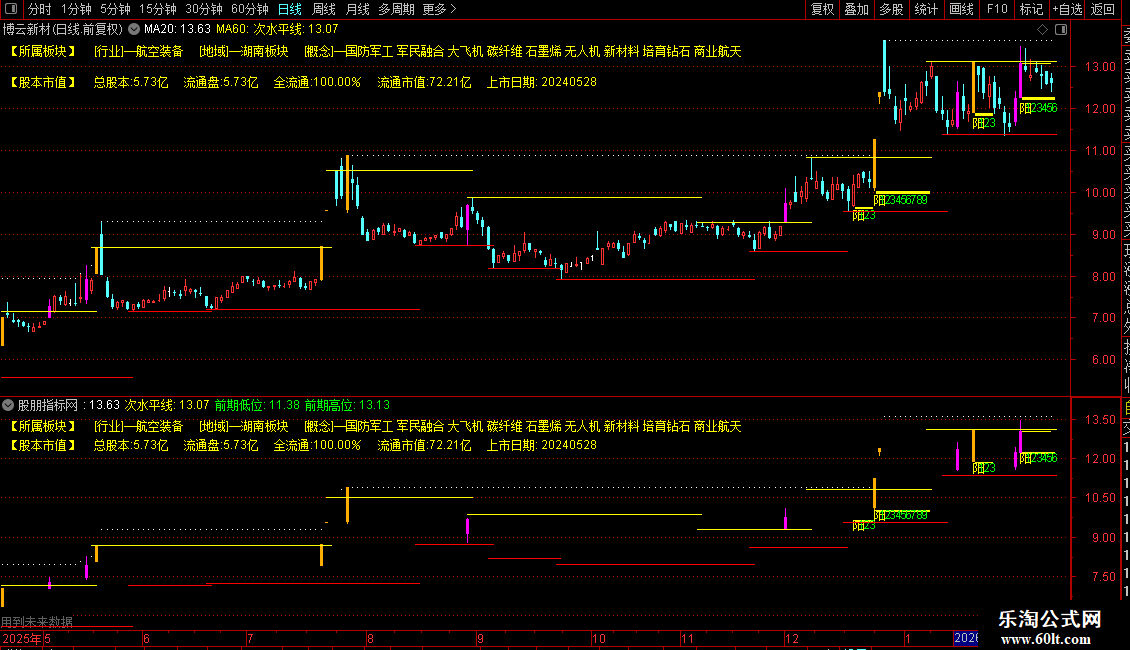1. 信息看板:在K线图左上角固定显示个股的所属板块(行业、地域、概念)、股本数据(总股本、流通盘、全流通比例、流通市值)及上市日期。