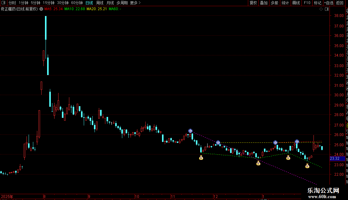 加载后,主图K线上会显示箭头标记的高低点,以及连接它们的水平延长线。这些线代表后续走势中可能的关键压力位和支撑位,用于辅助判断价格的波动区间和突破方向。
