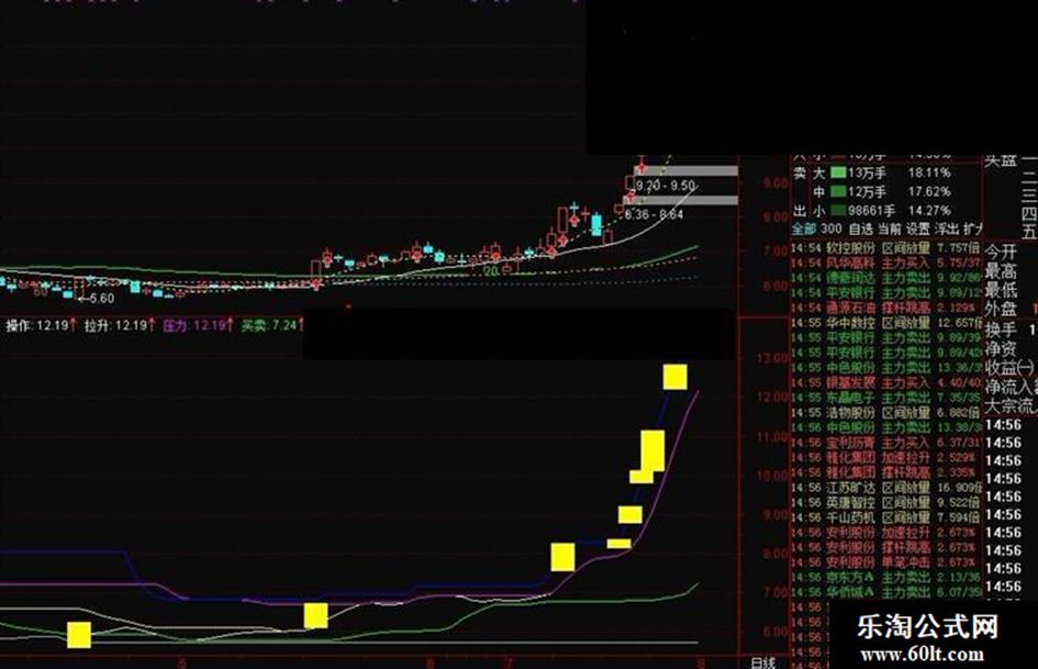 VAR4:=(LOW+HIGH+CLOSE)/3; 操作: MA(VAR4,5); 拉升: HHV(操作,13); 压力: HHV(操作,60); 买卖: LLV(操作,13); 底部支撑: LLV(LOW,60)*1.02; 顶部: HHV(HIGH,60)*0.98; STICKLINE(C>1.095*REF(C,1),O,C,8,0),COLORYELLOW;
